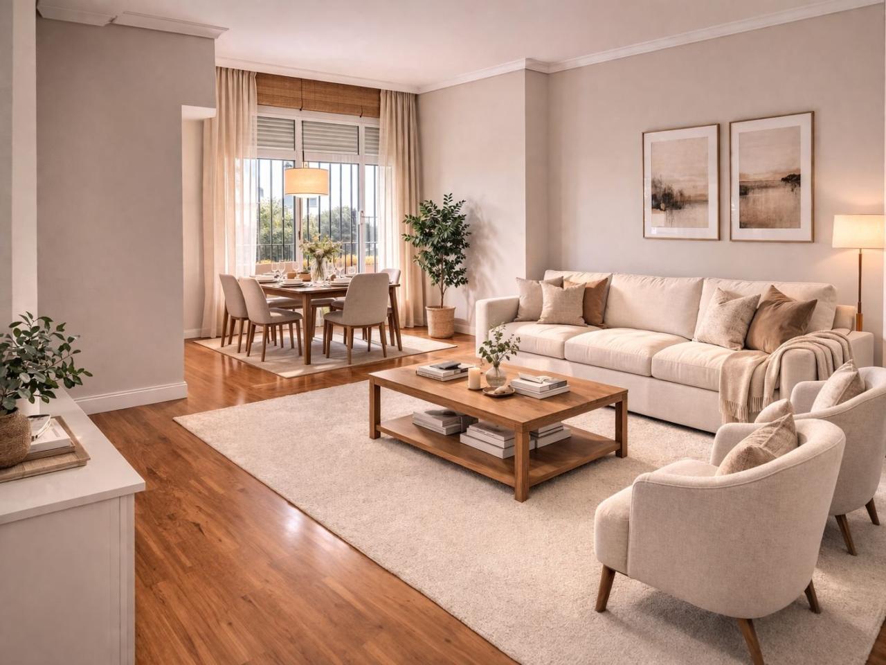 El salón, de gran tamaño, con dos ambientes bien diferenciados, nos conduce a una enorme terraza, de uso compartido con la vivienda aneja y con múltiples posibilidades.